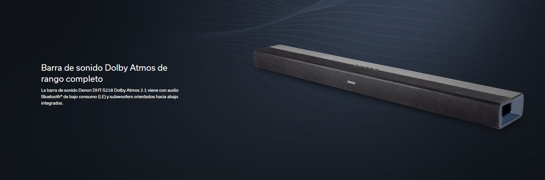 La Denon DHT-S218 es una barra de sonido delgada que cuenta con dos potentes subwoofers integrados orientados hacia abajo y Dolby Atmos para crear una potente experiencia de cine en casa sin un subwoofer independiente. Ahora transmita con baja latencia y sonido de mayor calidad a través del audio Bluetooth® Low Energy (LE).